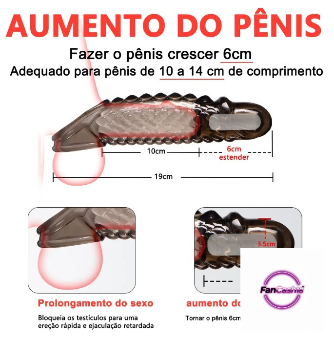 Esta capa peniana foi projetada de forma inteligente, com comprimento interno de 9 cm e diâmetro de 4 cm. Fabricada com material altamente elástico, ela é ideal para pênis com comprimento de 10 a 14 cm. O melhor é que ela pode aumentar seu pênis instantaneamente em 6 cm, além de engrossá-lo em 1 cm, oferecendo maior impacto e satisfação. Cada uso vai te dar uma nova confiança, enquanto sua parceira se perde em uma paixão intensa. Aproveite a oportunidade e torne-se o herói dela.