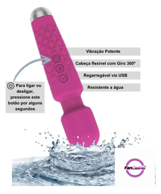Varinha Mágica – massageador feminino com 20 modos de vibração e 8 intensidades. Ideal para relaxamento e estímulo em áreas como corpo, clitóris, seios, pescoço, ombros e costas. Textura macia em silicone, cabeça flexível para maior conforto e resistência à água (respingo).